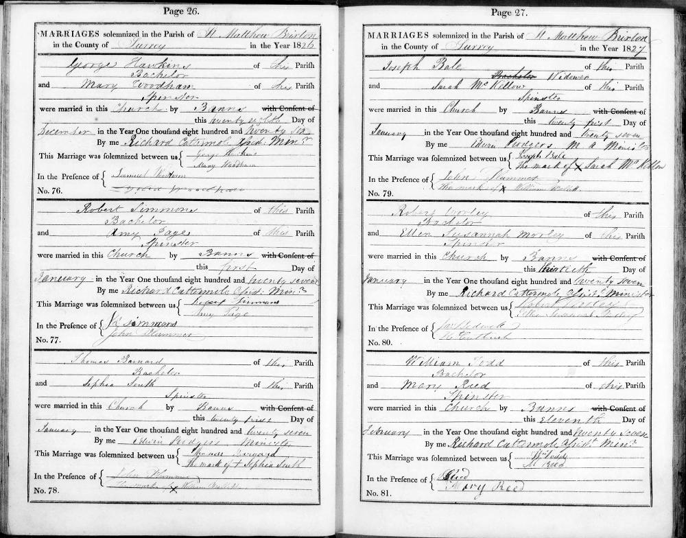 Marriage Certificate London Metropolitan Archives; London, England: Reference:p85/mtw1/035 Page 27 Entry 79 On 21 January 1827 at St Mathew, Brixton, Surrey Joseph BALE : age 42 a Widower person married Sarah MCKELLOW age 0026 a Widower person in the presence of John HAMMOND and William MAKKETT