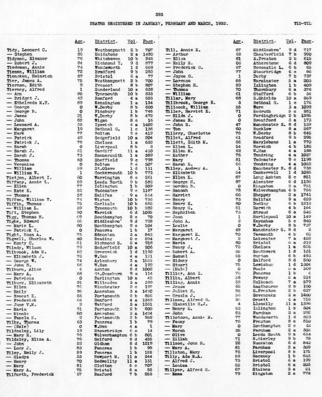 Death Register Stephen Henry TILL Born September 1872 : Died March 1932 Registered at Islington Volume 1b Page 409