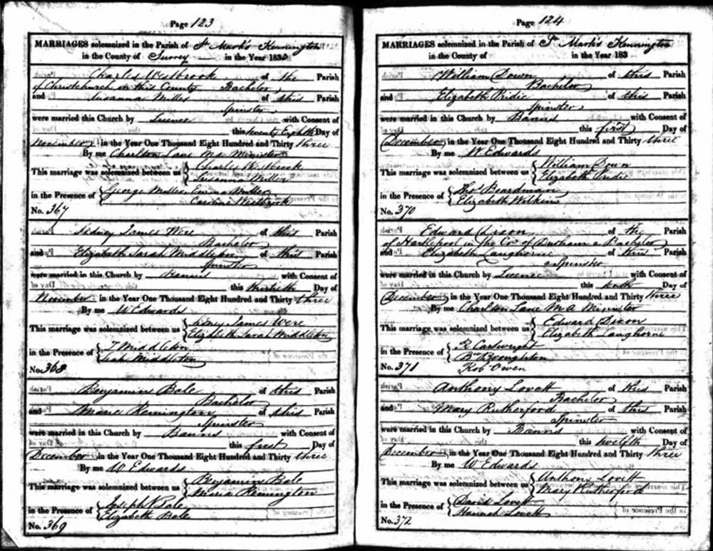 Marriage Certificate London, England, Church of England Marriages and Banns, 1754-1932: Page 123 Entry 368 On 1 December 1833 at St Mark, Kennington, Surrey Benjamin BALE : age 22 a Single person married Maria REMINGTON age 0025 a Single person in the presence of Joseph BALE and Elizabeth BALE
