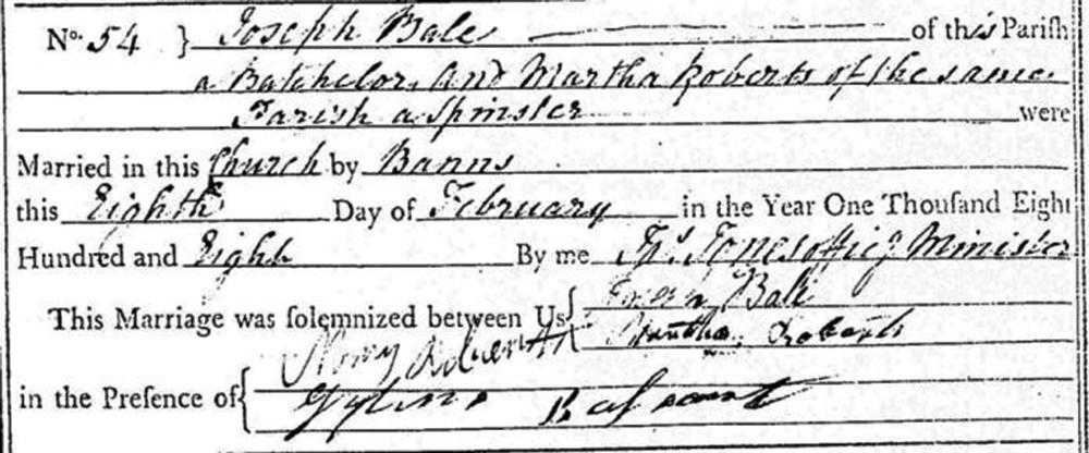Marriage Certificate Parish register - St Margaret of Antioch Rochester: Reference:entry 54 On 8 February 1808 at St Margaret of Antioch, Rochester, Kent Joseph BALE : age 23 a Single person married Martha ROBERTS age 0023 a Single person
