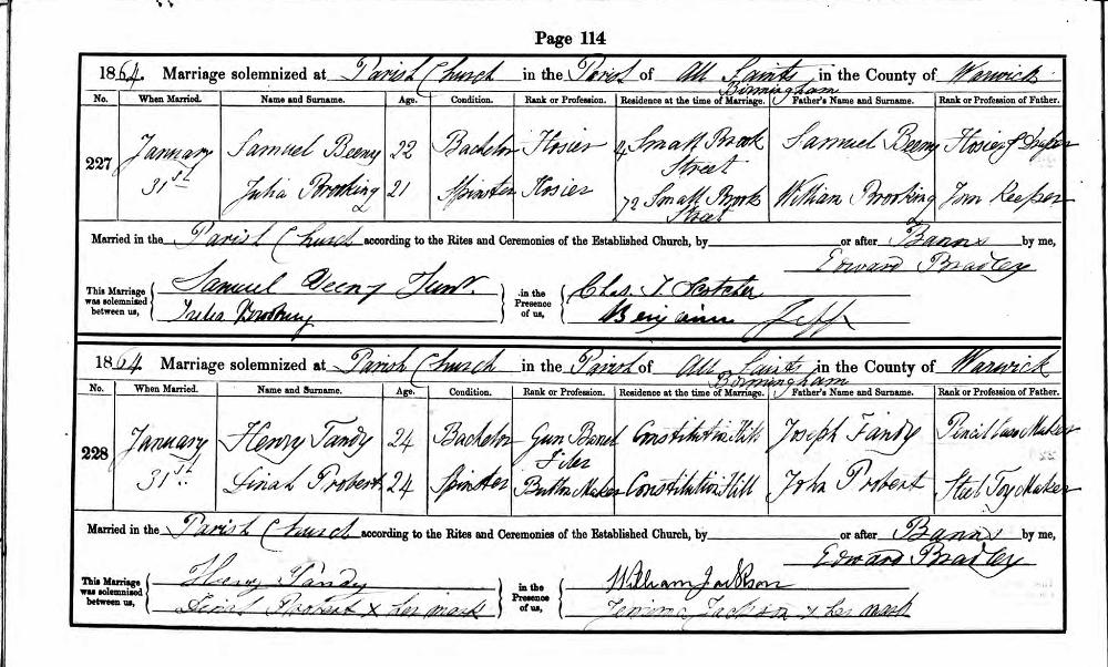 Marriage Certificate Birmingham, England, Church of England Marriages and Banns, 1754-1937: Page 114 Entry 228 On 31 January 1864 at All Saints Church, Birmingham William Henry TANDY : age 24 a Single person of Constitution Hill, Birmingham, Warwickshire a Gun Barel Filer married Dinah PROBERT age 0024 a Single person of Constitution Hill, Birmingham, Warwickshire a Gun Barel Filer in the presence of William JACKSON and Jemima JACKSON : The Husbands Father is Joseph TAMDY : shown as a Pencil Case Maker : The Wifes Father is Joseph TAMDY is shown as a Pencil Case Maker