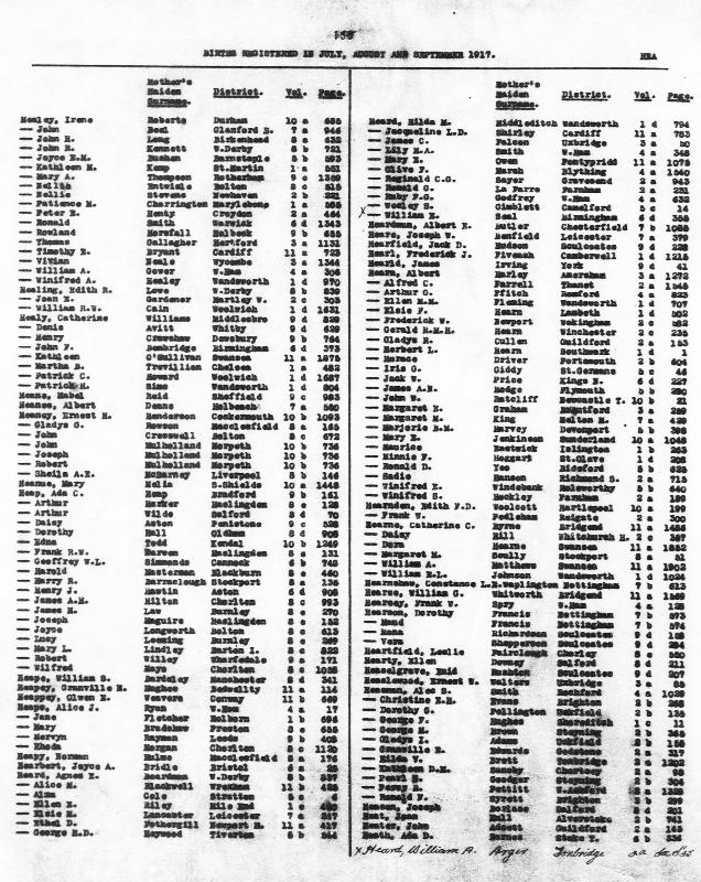 Ibid. John F HEALYRegistered at Birmingham on September 1917 Volume 6d Page 373 Mothers Maiden Name BEMBRIDGE