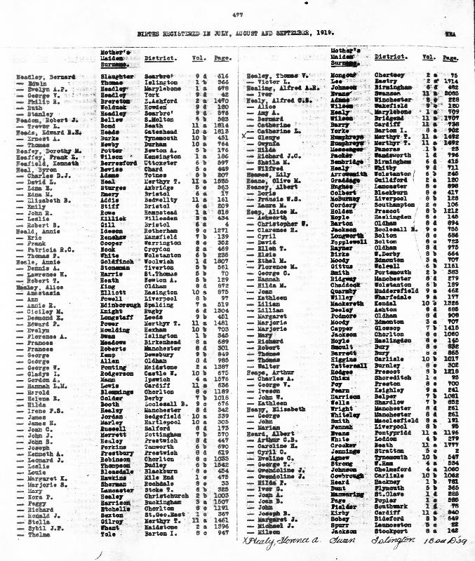 Birth Register Shelia M HEALYRegistered at Birmingham on September 1919 Volume 6d Page 415 Mothers Maiden Name BEMBRIDGE