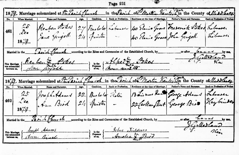 Marriage Certificate London, England, Church of England Marriages and Banns, 1754-1932 : Page 231 Entry 462 On 25 December 1879 at St Martins Parish Church, Kentish Town Joseph ADAMS : age 22 a Single person of 13, Lissimore Road, Kentish Town, Middlesex a Slater married Ann BIRD age 0024 a Single person of 13, Lissimore Road, Kentish Town, Middlesex a Slater in the presence of John SIDDONS and Amelia BIRD : The Husbands Father is George ADAMS : shown as a Labourer : The Wifes Father is George ADAMS is shown as a Labourer