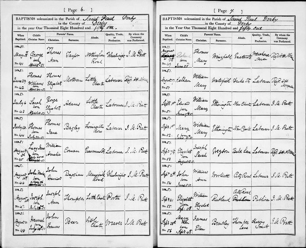 Baptised: Sarah ADAMS Born 10 April 1851 of Little Chester Was Baptised on 6 July 1851 at St Paul, Derby, Derbyshire, England, United Kingdom Father George Adams a Labourer Mother Elizabeth Adams (HALES) Source: Derbyshire, England, Church of England Baptisms, 1813-1916 Page 6 Entry no. 43