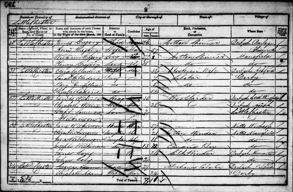 England Census 30 March 1851 : 34, Little Chester Little Chester Derbyshire Class HO107 Piece 2142 Folio 392 Page Number 9 GSU Roll 87772 9