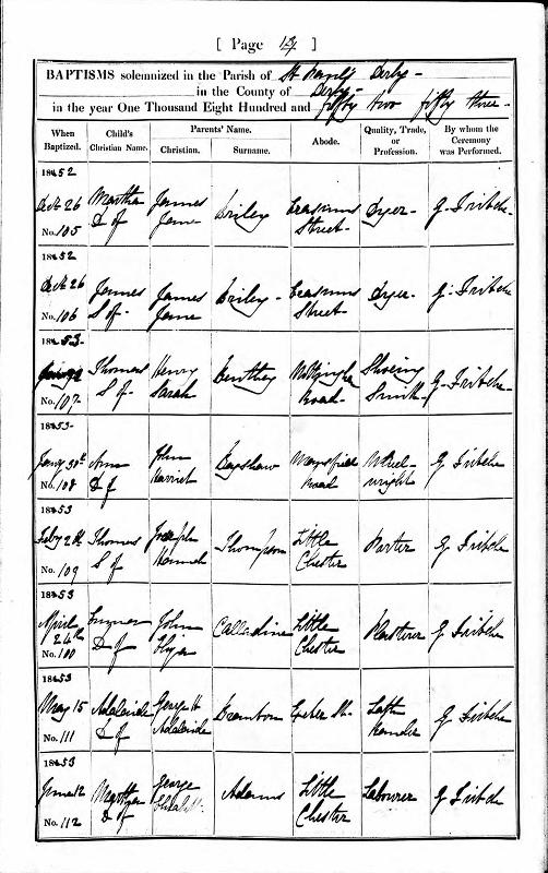 Ibid. Martha ADAMS of Little Chester, Derby Was Baptised on 12 June 1853 at Derby, Derbyshire, England, United Kingdom Father George ADAMS a Labourer Mother Elizabeth ADAMS (HALES) Source: England, Select Births and Christenings, 1538-1975 Page 14 Entry no. 112