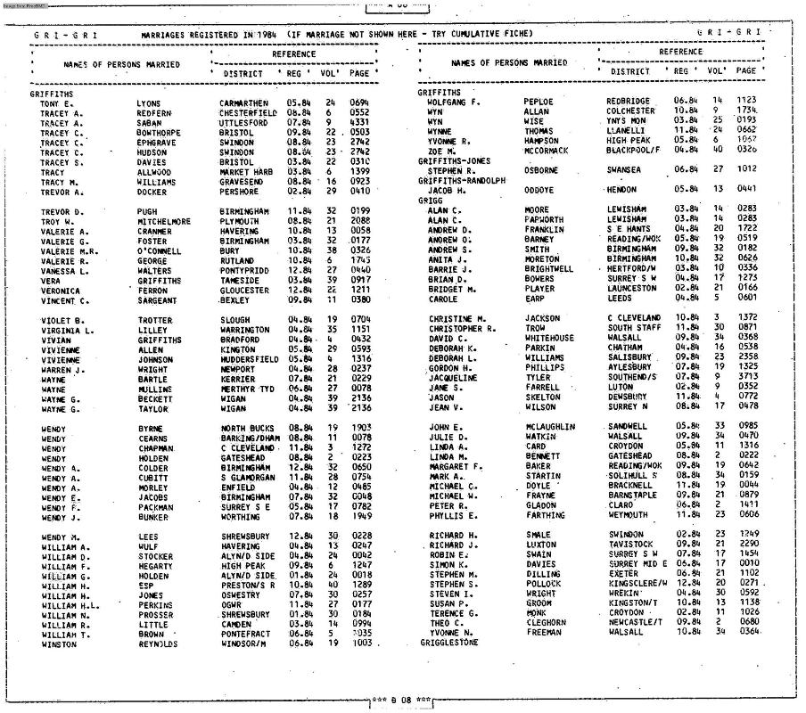 Wedding Register Glenn N WATKIN and Julie D GRIGG : Registered at Walsall During 15 September 1984 : Volume 34 : Page 470