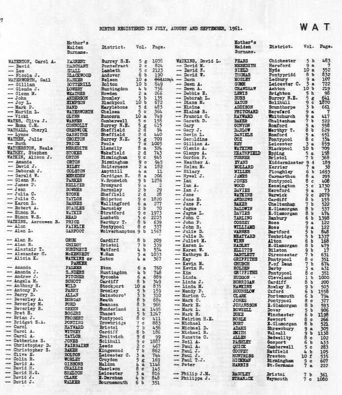 Birth Register Glenn N WATKINRegistered at West Bromwich on September 1961 Volume 9b Page 1276 Mothers Maiden Name PARKER