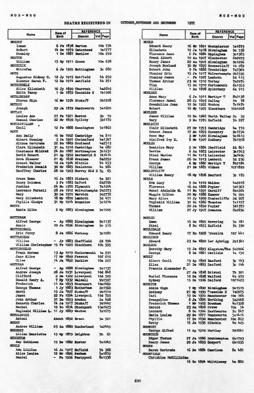 Death Register William James MOULD Born 1 August 1898 : Died 21 December 1970 Registered at Aylesbury Volume 6a Page 915