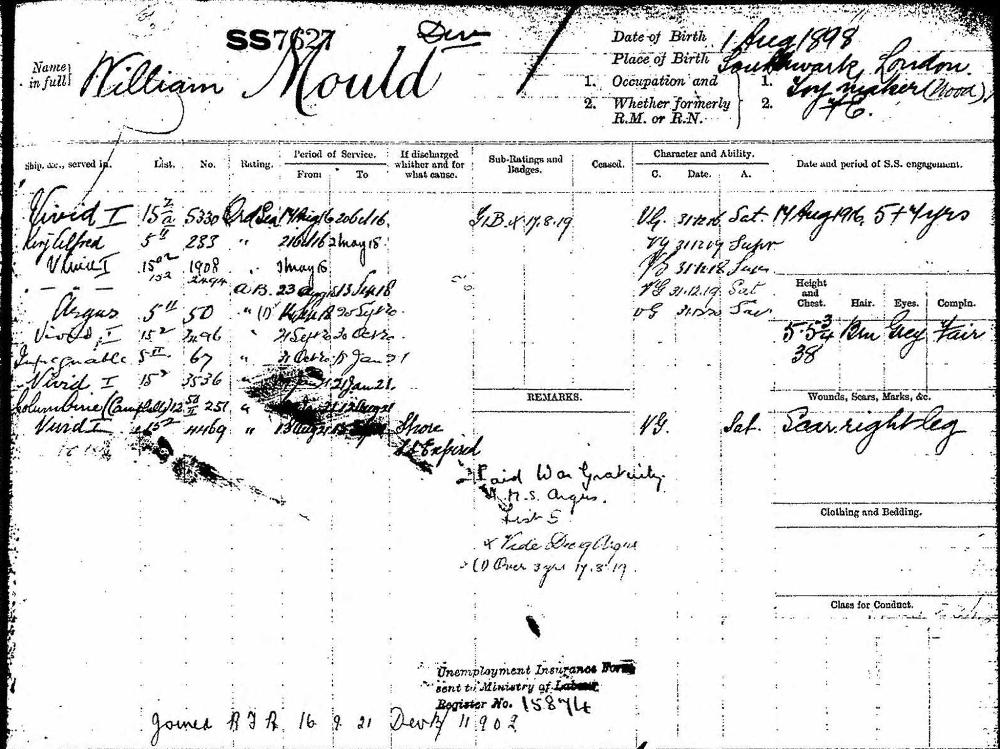 Military Record William MOULD (1 August 1898) Report Date 19 August 1916. Born in Southwark, Surrey, London. Nationality - British. Able Seaman Service Number S.S. 7627 Royal Navy. Navy Archive Reference ADM 288/1101/7627 and ADM 171/110. Record Collection - Royal Navy Register 1853-1924 / Roll of Naval War Medals 1914-1920 / Royal Navy War Medals 1914-1919. Was awarded British War Medal and Victory Medal campaign medals. Remarks Served on the ship Vivid I.