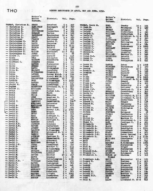 Birth Register Dennis A THOMASRegistered at Wednesbury on 22 May 1952 Volume 9b Page 1065 Mothers Maiden Name POOLE