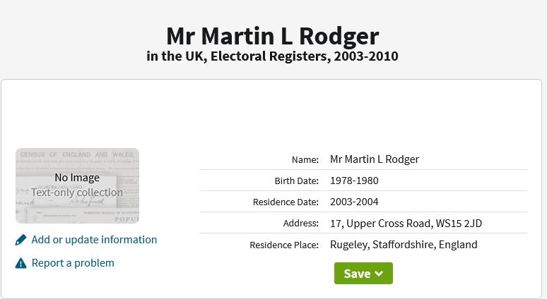Residence Details: 17, Upper Cross Road, Rugeley "2003–2004" : Source UK, Electoral Registers, 2003-2010