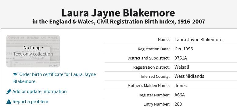 Birth Walsall Register number A66A Entry Number 288 Laura Jayne BLAKEMORE Registered at Walsall on 24 December 1996 Mothers Maiden Name JONES