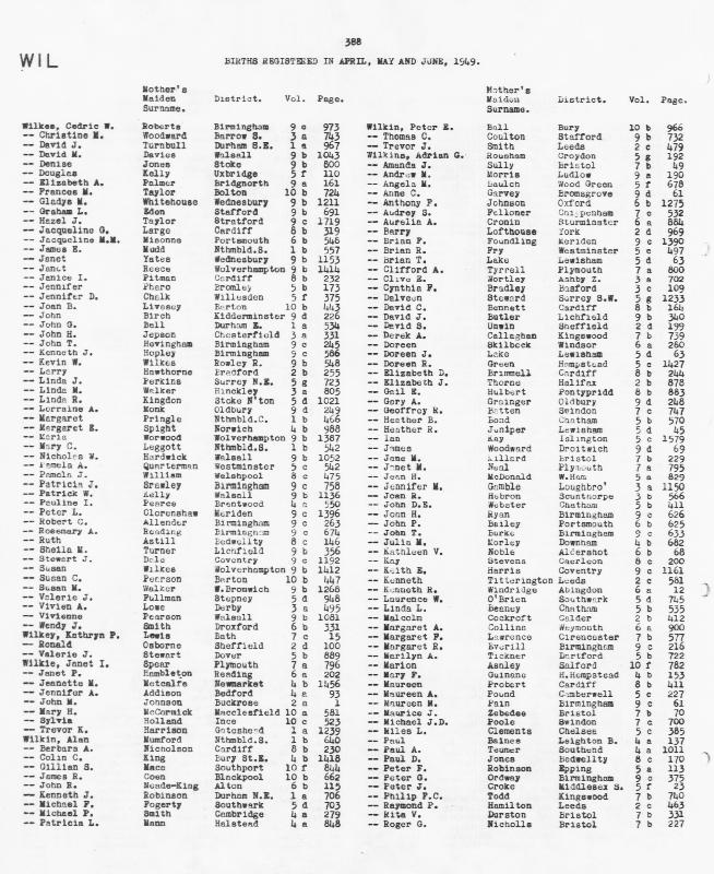 Birth Register Thomas Charles WILKINRegistered at Stafford on 18 May 1949 Volume 9b Page 732 Mothers Maiden Name COULTON