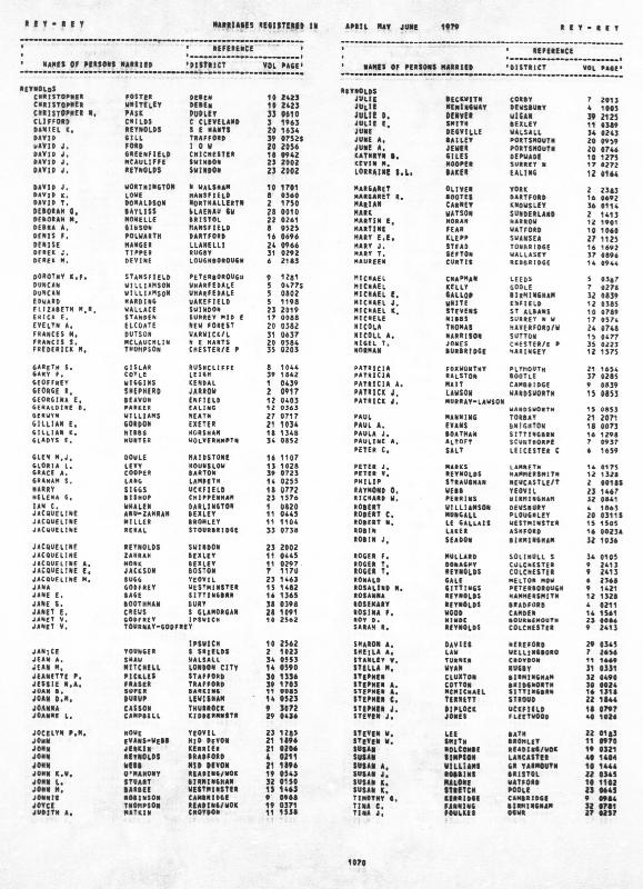 Wedding Register Christopher REYNOLDS and Joyce C PLANT : Registered at Dudley During 16 June 1979 : Volume 33 : Page 610