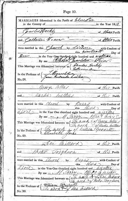 Marriage Certificate Bristol Archives; Bristol, England; Bristol Church of England Parish Registers: Reference:P/OV/R/3/b Page 10 Entry 29 On 3 April 1819 at Alveston, Gloucestershire George COLLINS married Amelia WATKINS in the presence of William GROOSTT and Elizabeth JONES
