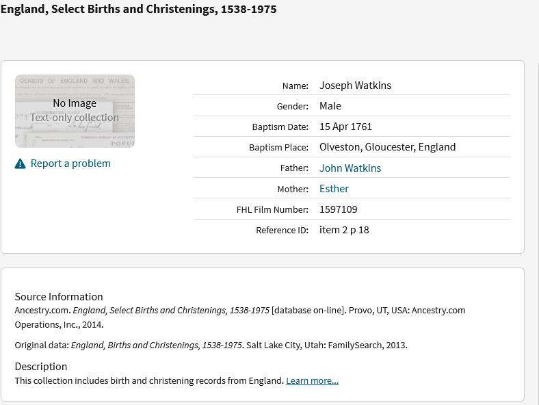 Ibid. Joseph WATKINS Was Baptised on 15 April 1761 at Olveston, Gloucestershire, England Father John WATKINS Mother Esther (Hester Elizabeth SINDRY) Source: England, Select Births and Christenings, 1538-1975 Page 2 Entry no. 18 Comments FHL Film Number 1597109