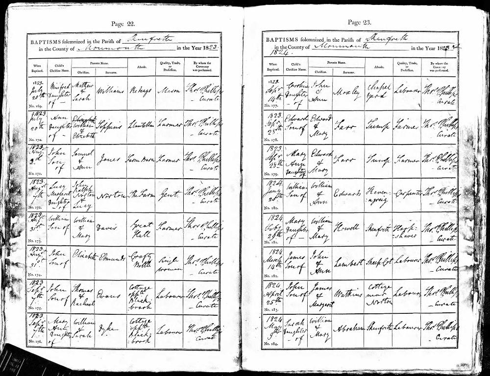 Baptised: John EVANS of Black Brook Cottage, Skenfrith, Monmouthshire Was Baptised on 7 September 1823 at Skenfrith, Monmouthshire Father John EVANS a labourer Mother Rachel EVANS (HINTON) Source: Monmouthshire, Wales, Anglican Baptisms, Marriages and Burials, 1551-1994 Page 22 Entry no. 175 Comments Page: 22 Entry: 175