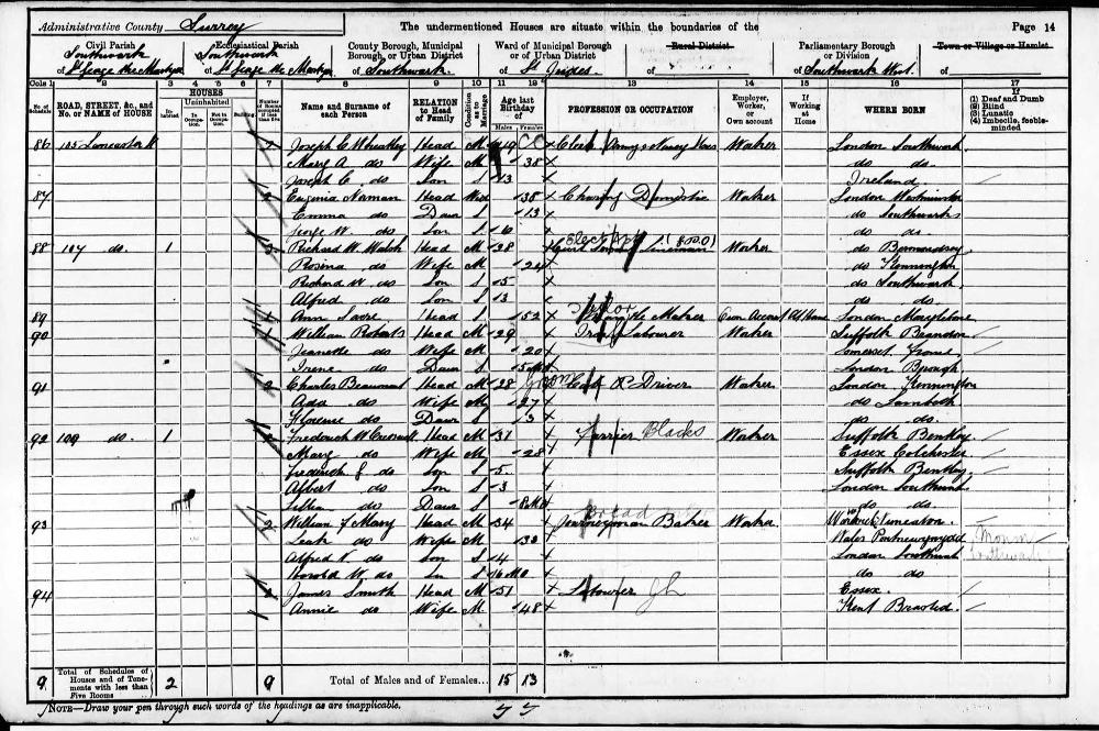England Census 13 March 1901 : 109, Lancaster Street Southwark Surrey District Southwark : Sub District London Road Parish St George the Martyr Class RG13 Piece 368 Folio 10 Schedule 92 Page Number 14 14