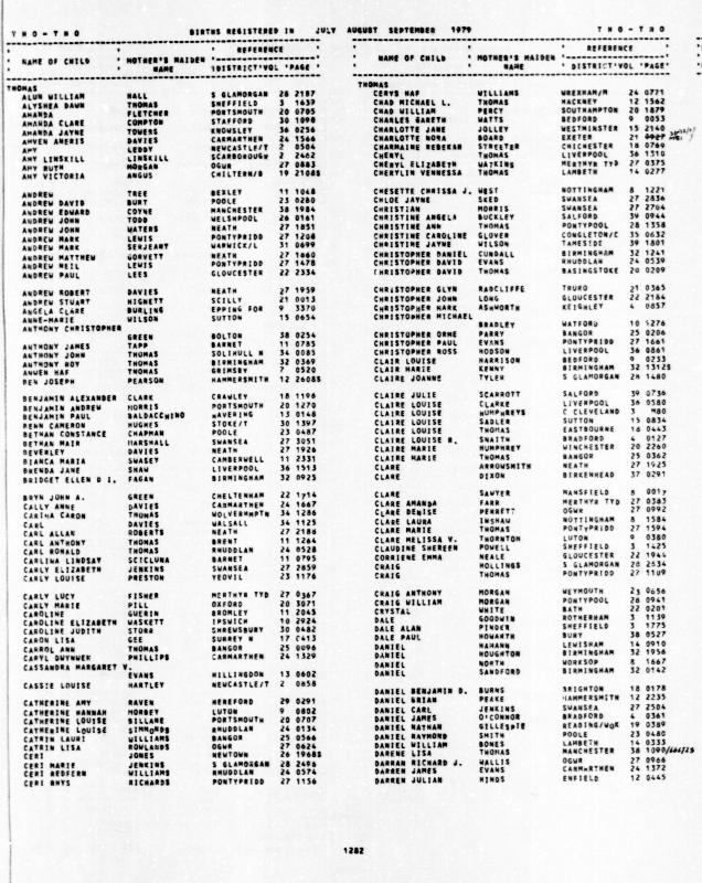 Birth Register Carl THOMASRegistered at Walsall on 12 July 1979 Volume 34 Page 1129 Mothers Maiden Name DAVIS