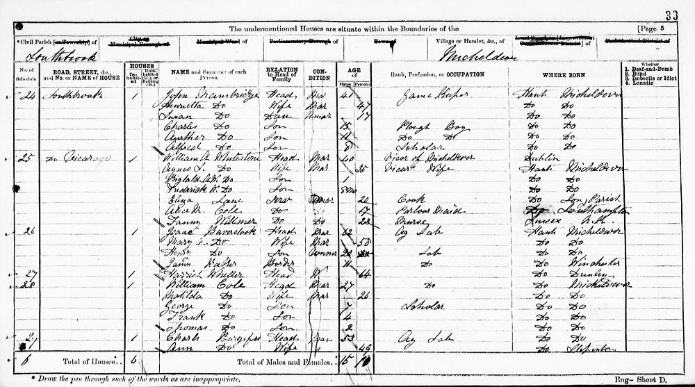 England Census 2 April 1871 : 24, Southbrook Micheldever Hampshire Class RG10 Piece 1207 Folio 33 Page Number 5 GSU Roll 827820 5