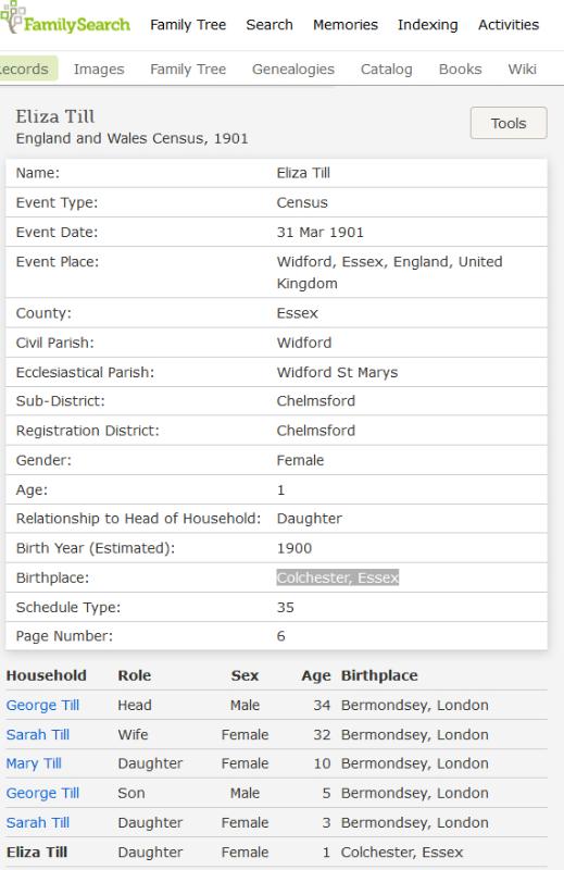 Birth Register Eliza TILLRegistered at Colchester on 19 December 1899 Volume 4a Page 775 Comments 3 'First Cousins' are all on the same page. Eliza TILL / A;bert James TILL / Arthur Charles TILL