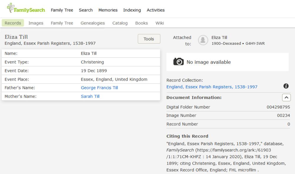 Christened: Eliza TILL Born 19 December 1899 Was Christened on 19 December 1899 at Essex, England Father George Francis TILL Mother Sarah TILL Source: England and Essex Parish Registers, 1538-1997 Digital Folder Number 004298795 Image Nuber 00234 Record Number 0