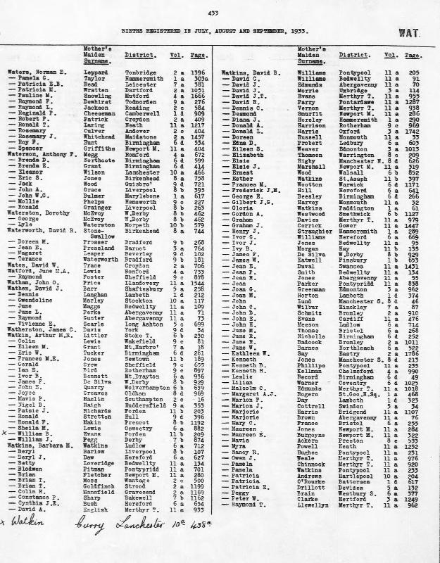 Birth Register Spencer WATERSRegistered at Newport, Monmouthshire on 28 July 1933 Volume 11a Page 494 Mothers Maiden Name GRIFFITHS