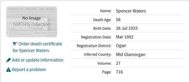 Death Register Spencer WATERS Born 28 July 1933 : Died March 1992 Registered at ogwr Volume 27 Page 716