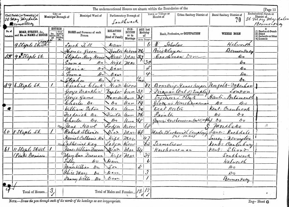 England Census 3 April 1881 : 9, Staple Street Bermondsey London District St Olave Southwark Class RG11 Piece 559 Folio 69 Page Number 12 GSU Roll 1341127 12