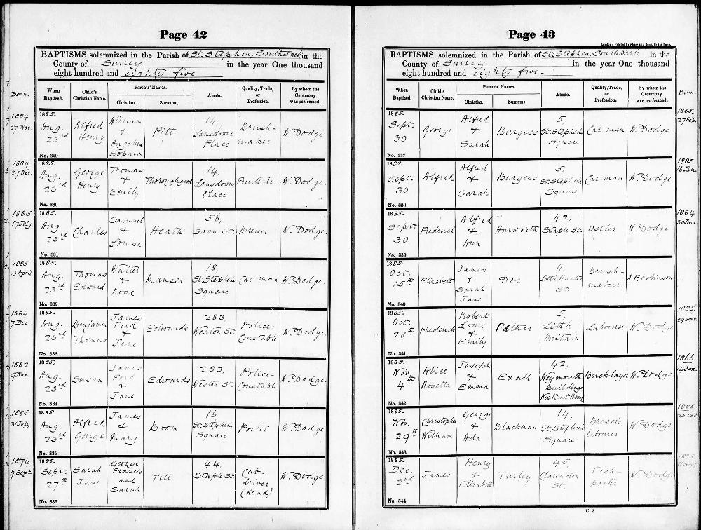 Baptised: Sarah Jane TILL Born 9 September 1874 of 44, Staple Street, Southwark, Surrey Was Baptised on 27 September 1885 at St Stephen, Southwark, Surrey Father George Francis TILL (Deceased) a Cab Driver Mother Sarah TILL (BALE) Source: London, England, Church of England Births and Baptisms, 1813-1917 Page 42 Entry no. 346
