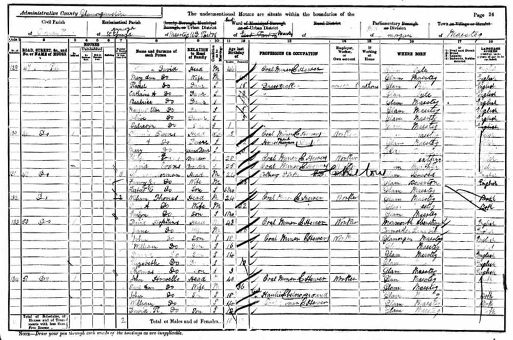 Wales Census 13 March 1901 : 49, Garth Road Maesteg Glamorgan, Wales District Bridgend : Sub District Maesteg Parish Llangynwyd St Cynwyd Emuneration District 7 Class RG13 Piece 5041 Folio 41 Schedule 132 Page Number 24 24