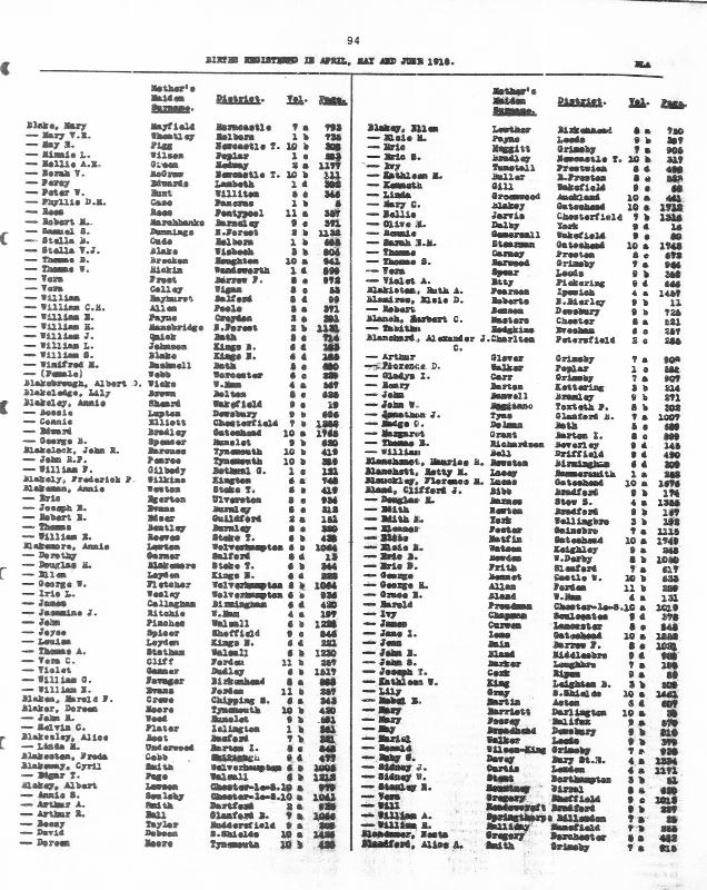 Birth Register John BLAKEMORERegistered at Walsall on 24 May 1918 Volume 6b Page 1228 Mothers Maiden Name PINCHES