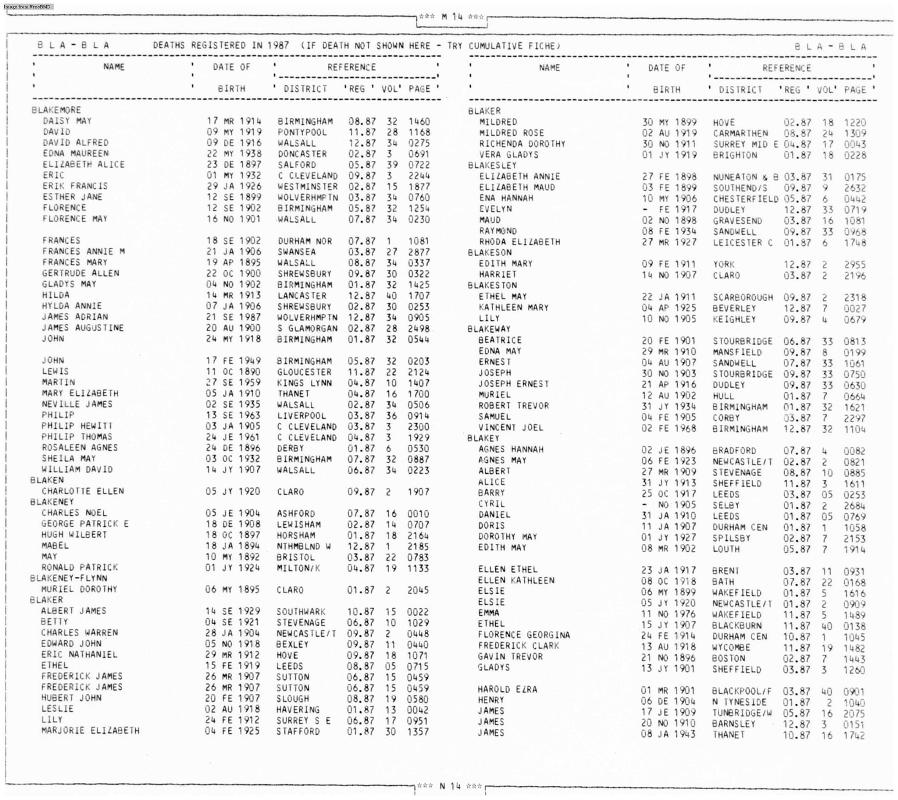 Death Register John BLAKEMORE Born 24 May 1918 : Died January 1987 Registered at Birmingham Volume 32 Page 0544