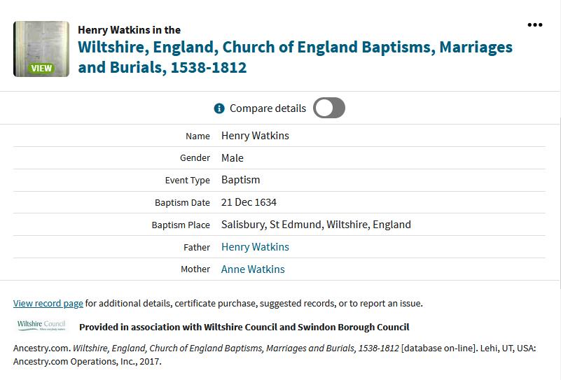 Baptised: Henry WATKINS Was Baptised on 21 December 1634 at Salisbury, Wiltshire, England Father Henry Watkins Mother Anne (Watkins) Source: Wiltshire, England, Church of England Baptisms, Marriages and Burials, 1538-1812