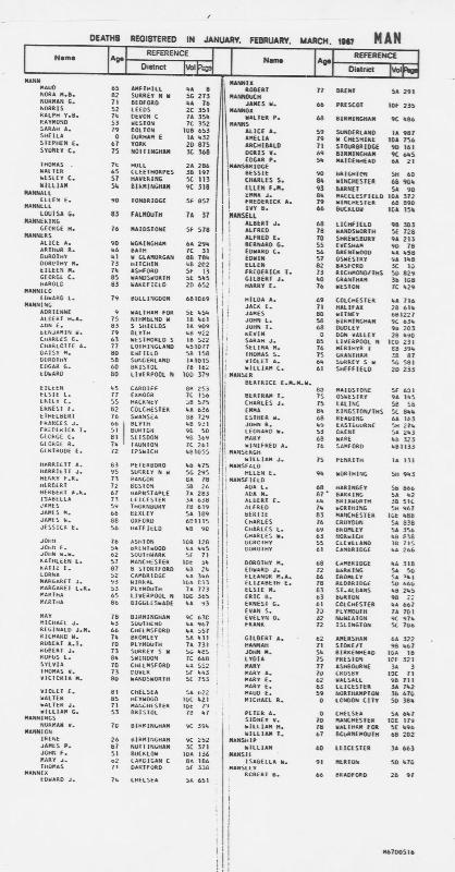 Death Register Charles Sandom MANSBRIDGE Born 5 November 1882 : Died March 1967 Registered at Winchester Volume 6b Page 904
