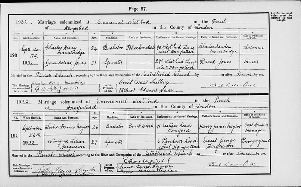 Marriage Certificate London, England, Church of England Marriages and Banns, 1754-1932: Page 97 Entry 193 On 17 September 1932 at Emanuel Church, West End Lane, West Hampstead, London Charles Henry MANSBRIDGE : age 24 a Single person of 90, West End Lane, Hampstead, London a Police Constable married Gwenlian JONES age 0021 a Single person of 90, West End Lane, Hampstead, London a Police Constable in the presence of Ernest SNELLING and Albert Edward LEWIS : The Husbands Father is Charles Sandom MANSBRIDGE : shown as a Labourer : The Wifes Father is Charles Sandom MANSBRIDGE is shown as a Labourer