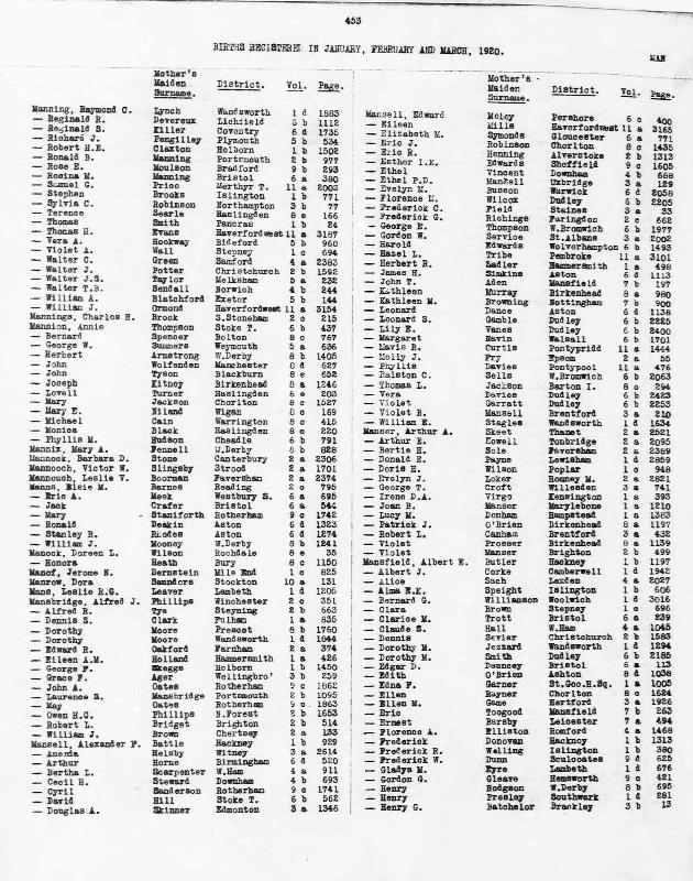 Birth Register Alfred John MANSBRIDGERegistered at Winchester on 13 March 1920 Volume 2c Page 351 Mothers Maiden Name PHILLIPS
