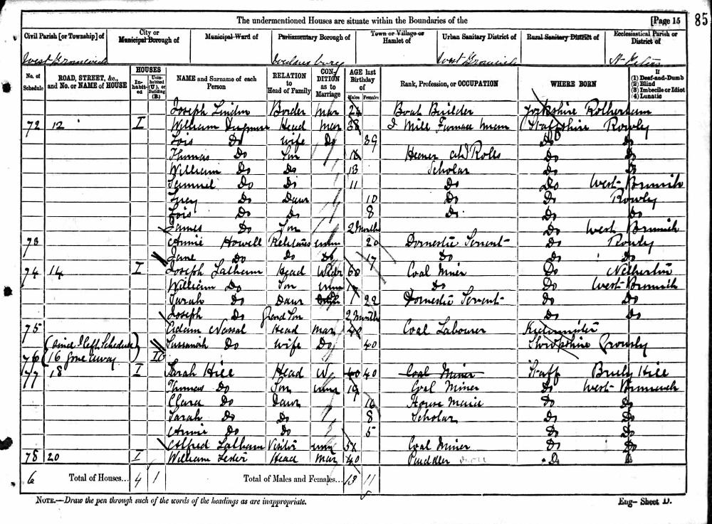 England Census 3 April 1881 : 20, Sand Street West Bromwich Staffordshire District West Bromwich : Sub District West Bromwich South West Parish St Peter Emuneration District 25 Piece 2847 Folio 85 Page Number 16 16