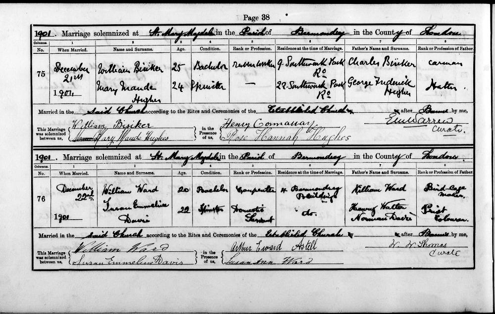 Marriage Certificate London Metropolitan Archives; London, England: Page 38 Entry 76 On 27 December 1901 at St Mary Magdeline, Bermondsey William George WARD : age 20 a Single person of 4, Bermondsey Buildings, Southwark a Carpenter married Susan Emmeline DAVIS age 0022 a Single person of 4, Bermondsey Buildings, Southwark a Carpenter in the presence of Arthur Edward ASTELL and Susan Ann WARD : The Husbands Father is William WARD : shown as a Birdcge maker : The Wifes Father is William WARD is shown as a Birdcge maker