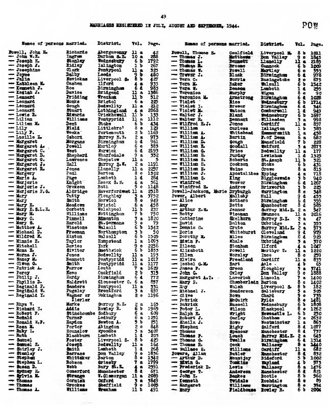 Wedding Register Leslie JONES and Morna J POWELL : Registered at Bedwellty During July 1944 : Volume 11a : Page 193