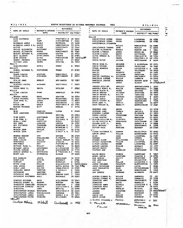 Ibid. David Andrew MILLERRegistered at Stafford on December 1983 Volume 30 Page 0995 Mothers Maiden Name HAYWOOD
