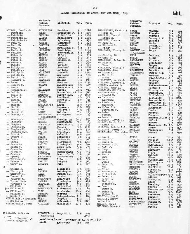 Birth Register Stuart Derek MILLERRegistered at Walsall on April 1955 Volume 9b Page 994 Mothers Maiden Name TILL