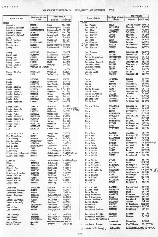 Ibid. Lindsey Kay JONESRegistered at West Bromwich on 19 August 1971 Volume 9b Page 3203 Mothers Maiden Name GOPSILL