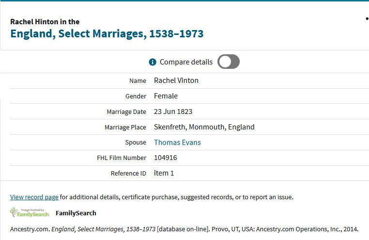 Wedding Details Thomas EVANS and Rachel HINTON : at Skenfrith, Monmouthshire During 23 June 1823 (Surname mis-spelt as VINTON)