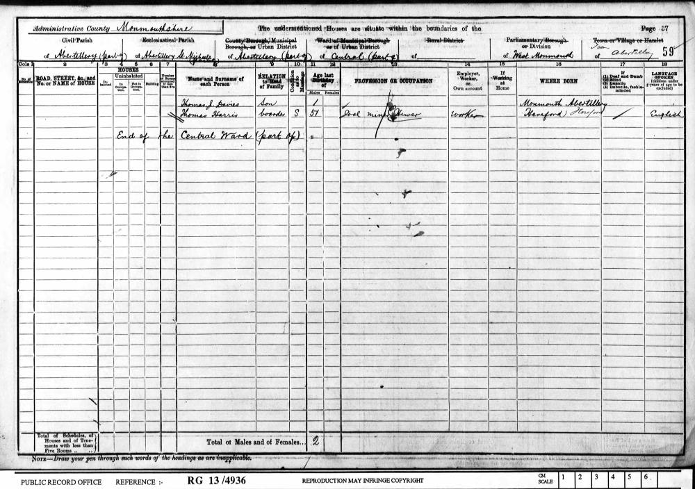 Wales Census 5 April 1891 : 10, Mount Pleasant Row Abertillery Monmouthshire District Bedwellty : Sub District Aberystruth Parish St Michael Emuneration District 12 Class RG12 Piece 4353 Folio 85 Page Number 33 GSU Roll 6099463 33