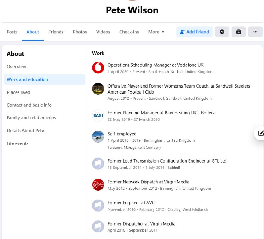 Occupation Peter William WILSON Born/age 21 April 1981 : Date "April 2010–September 2011" Dispatcher at Virgin Medias Source Facebook Entry by Peter William WILSON