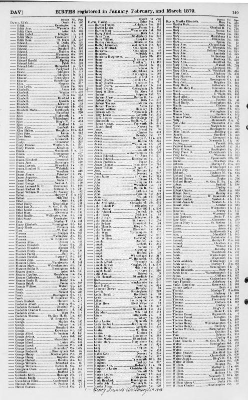 Birth Register Susan Emmeline DAVISRegistered at Greenwich on March 1879 Volume 1d Page 999