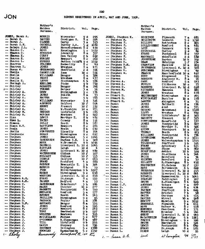 Birth Register Stephen John JONESRegistered at Lichfield on 29 March 1954 Volume 9b Page 255 Mothers Maiden Name TILL